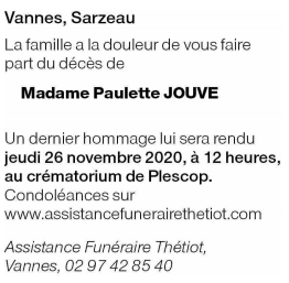 Décédée à Vannes (56000, France) le dimanche 22 novembre 2020 à l'âge de 87 ans