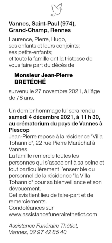 Décédé à Vannes (56000, France) le samedi 27 novembre 2021 à l'âge de 78 ans