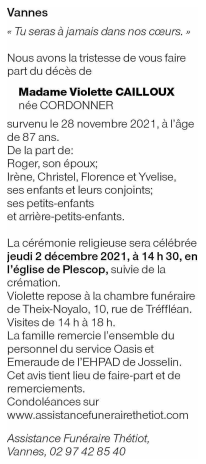 Décédée à Josselin (56120, France) le dimanche 28 novembre 2021 à l'âge de 87 ans