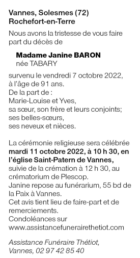 Décédée à Vannes (56000, France) le vendredi 7 octobre 2022 à l'âge de 91 ans