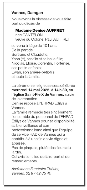 Décédée à Vannes (56000, France) le vendredi 9 mai 2025 à l'âge de 101 ans