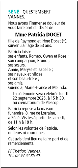 Décédée à Vannes (56000, France) le jeudi 18 septembre 2025 à l'âge de 53 ans