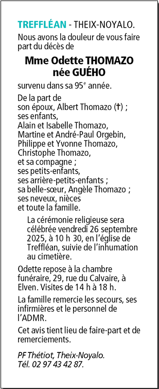Décédée à Treffléan (56250, France) le mardi 23 septembre 2025 à l'âge de 94 ans