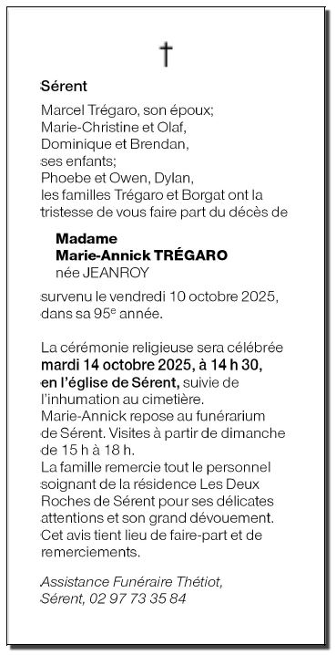 Décédée à Sérent (56460, France) le vendredi 10 octobre 2025 à l'âge de 94 ans