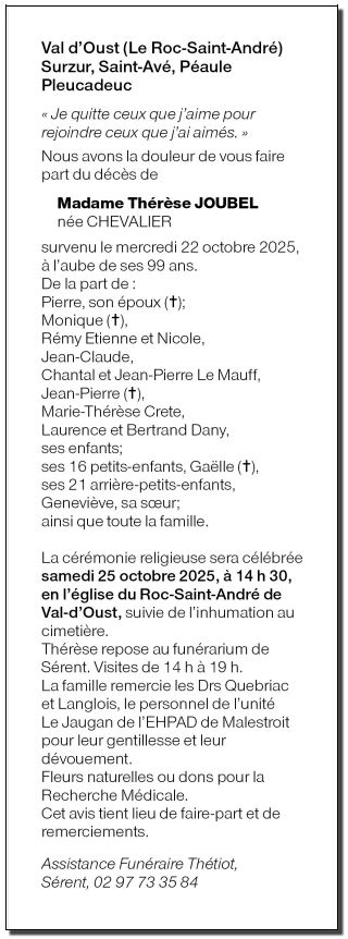 Décédée à Malestroit (56140, France) le mercredi 22 octobre 2025 à l'âge de 98 ans