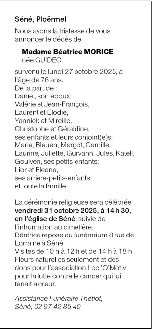 Décédée à Sene (56860, France) le lundi 27 octobre 2025 à l'âge de 76 ans
