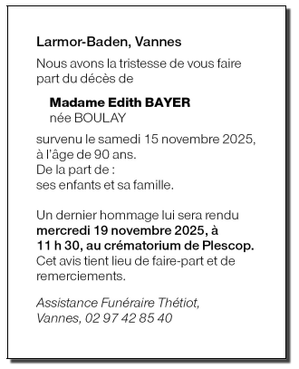 Décédée à Vannes (56000, France) le samedi 15 novembre 2025 à l'âge de 90 ans