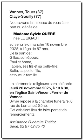 Décédée à Vannes (56000, France) le dimanche 16 novembre 2025 à l'âge de 67 ans