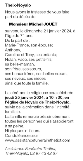 Décédé à Theix-Noyalo (56450, France) le dimanche 21 janvier 2024 à l'âge de 71 ans