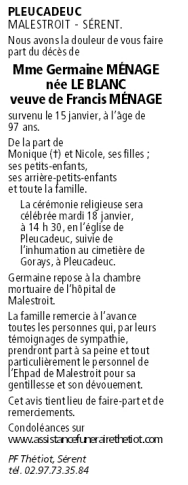 Décédée à Malestroit (56140, France) le samedi 15 janvier 2022 à l'âge de 97 ans