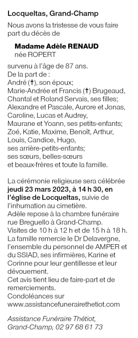 Décédée à Locqueltas (56390, France) le dimanche 19 mars 2023 à l'âge de 87 ans