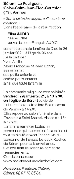 Décédée à Sérent (56460, France) le mardi 26 janvier 2021 à l'âge de 96 ans