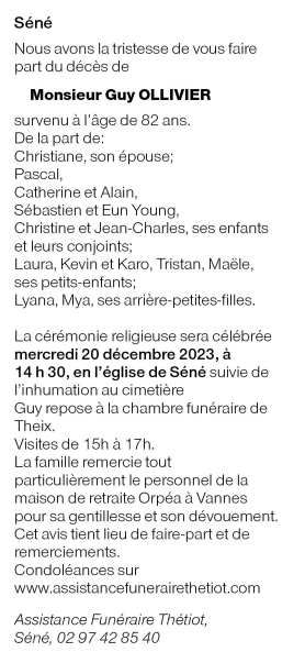 Décédé à Vannes (56000, France) le samedi 16 décembre 2023 à l'âge de 82 ans
