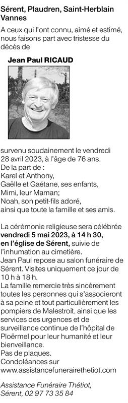 Décédé à Ploermel (56800, France) le vendredi 28 avril 2023 à l'âge de 76 ans
