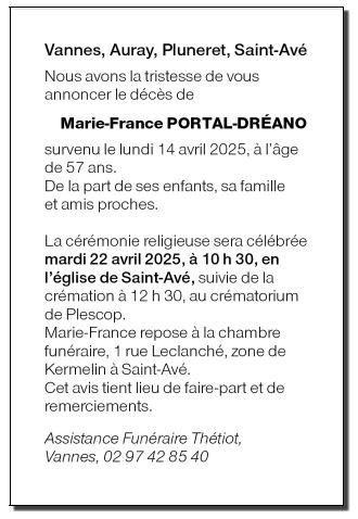 Décédée à Vannes (56000, France) le lundi 14 avril 2025 à l'âge de 57 ans