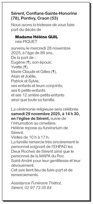 Décédée à Sérent (56460, France) le mercredi 26 novembre 2025 à l'âge de 89 ans