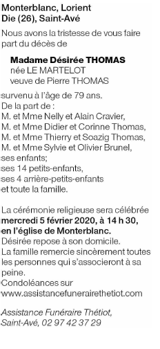 Décédée à Monterblanc (56250, France) le samedi 1 février 2020 à l'âge de 79 ans