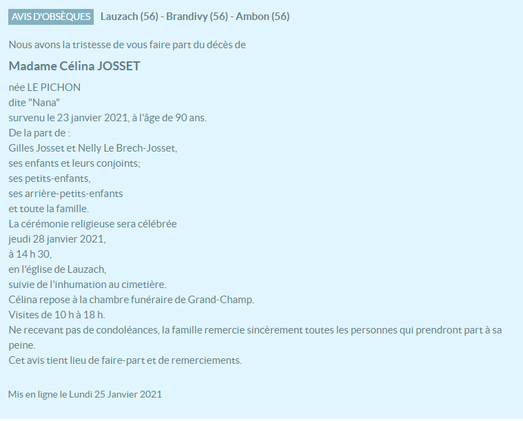 Décédée à Sainte-Anne-d'Auray (56400, France) le samedi 23 janvier 2021 à l'âge de 90 ans