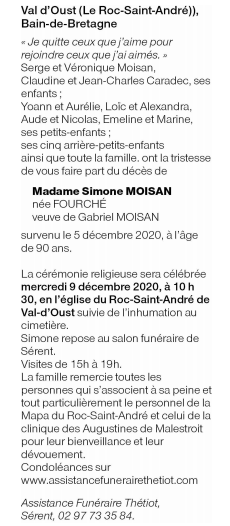 Décédée à Malestroit (56140, France) le samedi 5 décembre 2020 à l'âge de 90 ans