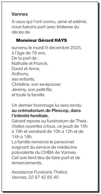 Décédé à Vannes (56000, France) le mardi 9 décembre 2025 à l'âge de 78 ans
