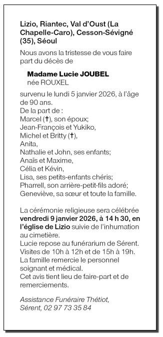Décédée à Ploermel (56800, France) le lundi 5 janvier 2026 à l'âge de 90 ans