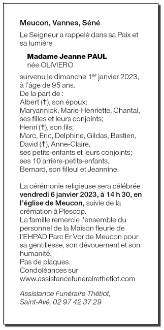 Décédée à Meucon (56890, France) le dimanche 1 janvier 2023 à l'âge de 95 ans
