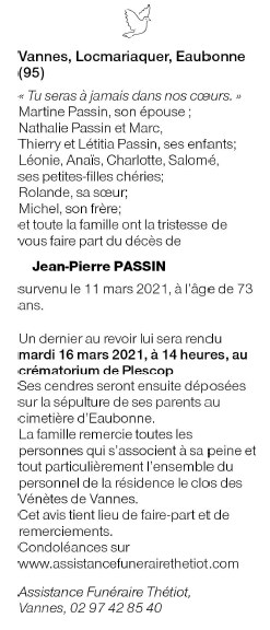 Décédé à Vannes (56000, France) le jeudi 11 mars 2021 à l'âge de 73 ans