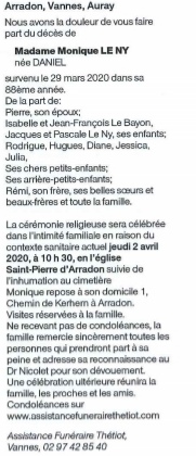 Décédée à Vannes (56000, France) le dimanche 29 mars 2020 à l'âge de 87 ans