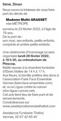 Décédée à Sene (56860, France) le mercredi 23 février 2022 à l'âge de 79 ans