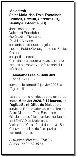 Décédée à Malestroit (56140, France) le samedi 3 janvier 2026 à l'âge de 81 ans