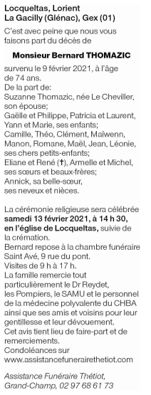 Décédé à Vannes (56000, France) le mardi 9 février 2021 à l'âge de 74 ans