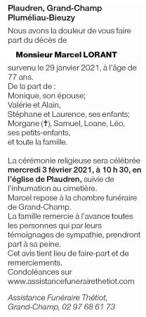 Décédé à Plaudren (56420, France) le vendredi 29 janvier 2021 à l'âge de 77 ans