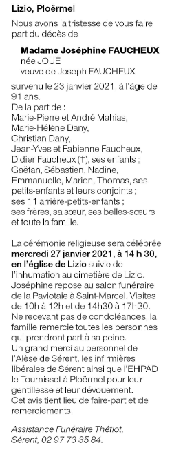 Décédée à Ploermel (56800, France) le samedi 23 janvier 2021 à l'âge de 91 ans
