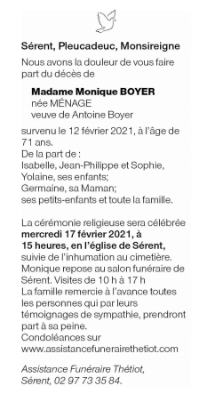Décédée à Sérent (56460, France) le jeudi 11 février 2021 à l'âge de 71 ans