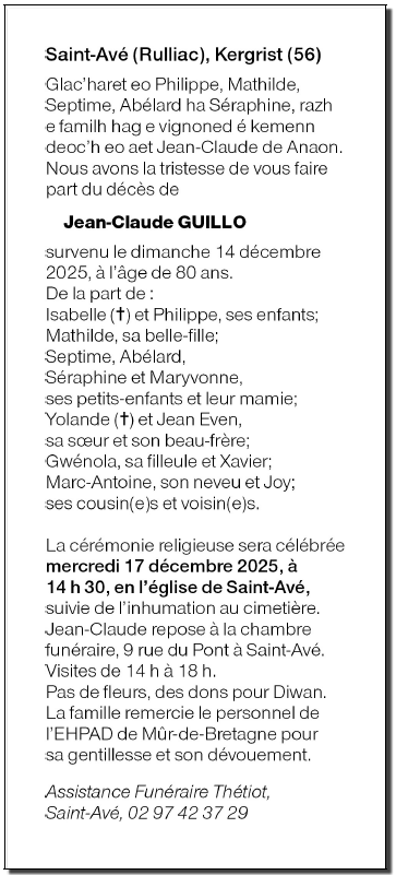 Décédé à Mur de Bretagne (22530, France) le dimanche 14 décembre 2025 à l'âge de 80 ans