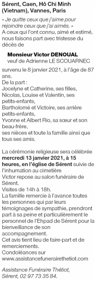 Décédé à Sérent (56460, France) le vendredi 8 janvier 2021 à l'âge de 87 ans