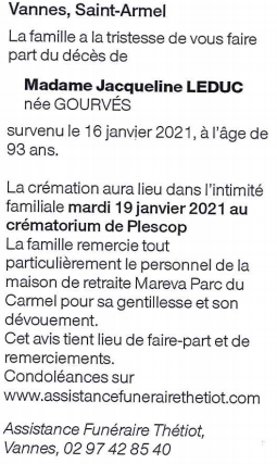 Décédée à Vannes (56000, France) le samedi 16 janvier 2021 à l'âge de 93 ans
