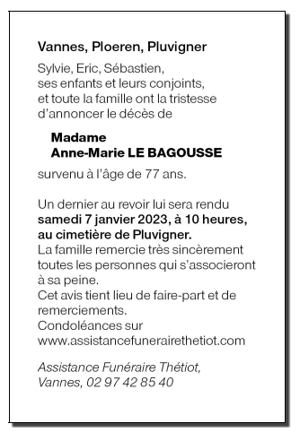 Décédée à Vannes (56000, France) le mardi 3 janvier 2023 à l'âge de 77 ans