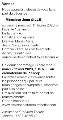 Décédé à Vannes (56000, France) le mercredi 1 février 2023 à l'âge de 102 ans