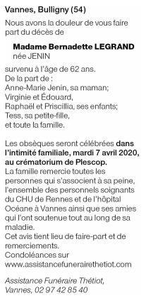 Décédée à Vannes (56000, France) le jeudi 2 avril 2020 à l'âge de 62 ans