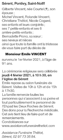 Décédé à Sérent (56460, France) le lundi 1 février 2021 à l'âge de 91 ans