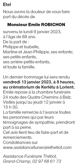 Décédé à Auray (56400, France) le lundi 9 janvier 2023 à l'âge de 88 ans