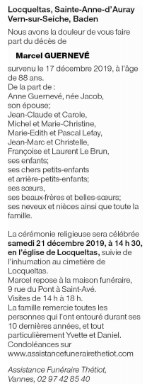 Décédé à Meucon (56890, France) le mardi 17 décembre 2019 à l'âge de 88 ans