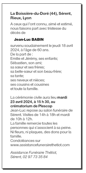 Décédé à La Boissière-du-Doré (44430, France) le jeudi 18 avril 2024 à l'âge de 60 ans