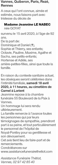 Décédée à Noyal-Pontivy (56920, France) le mercredi 15 avril 2020 à l'âge de 92 ans
