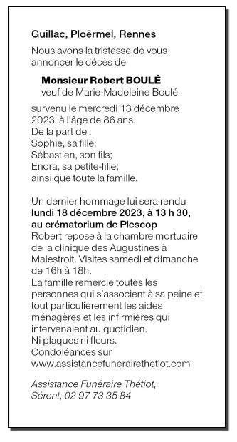 Décédé à Malestroit (56140, France) le mercredi 13 décembre 2023 à l'âge de 86 ans