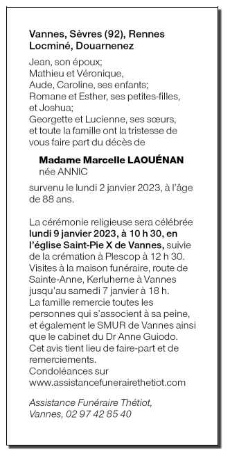 Décédée à Vannes (56000, France) le lundi 2 janvier 2023 à l'âge de 88 ans