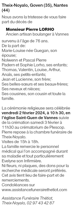 Décédé à Theix-Noyalo (56450, France) le lundi 29 janvier 2024 à l'âge de 76 ans