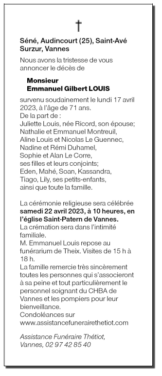 Décédé à Vannes (56000, France) le lundi 17 avril 2023 à l'âge de 71 ans