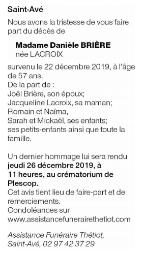 Décédée à Vannes (56000, France) le dimanche 22 décembre 2019 à l'âge de 57 ans